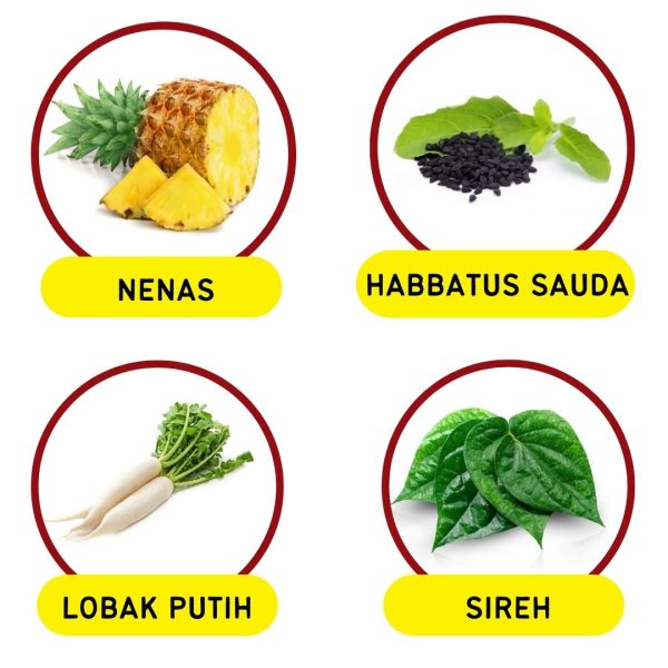 4 bahan diatas iaitu Sireh, Nenas, Lobak Putih dan Habbatus Sauda juga ada didalam Jus Botani ini untuk memberikan impak yang lagi baik bagi membantu masalah ini.